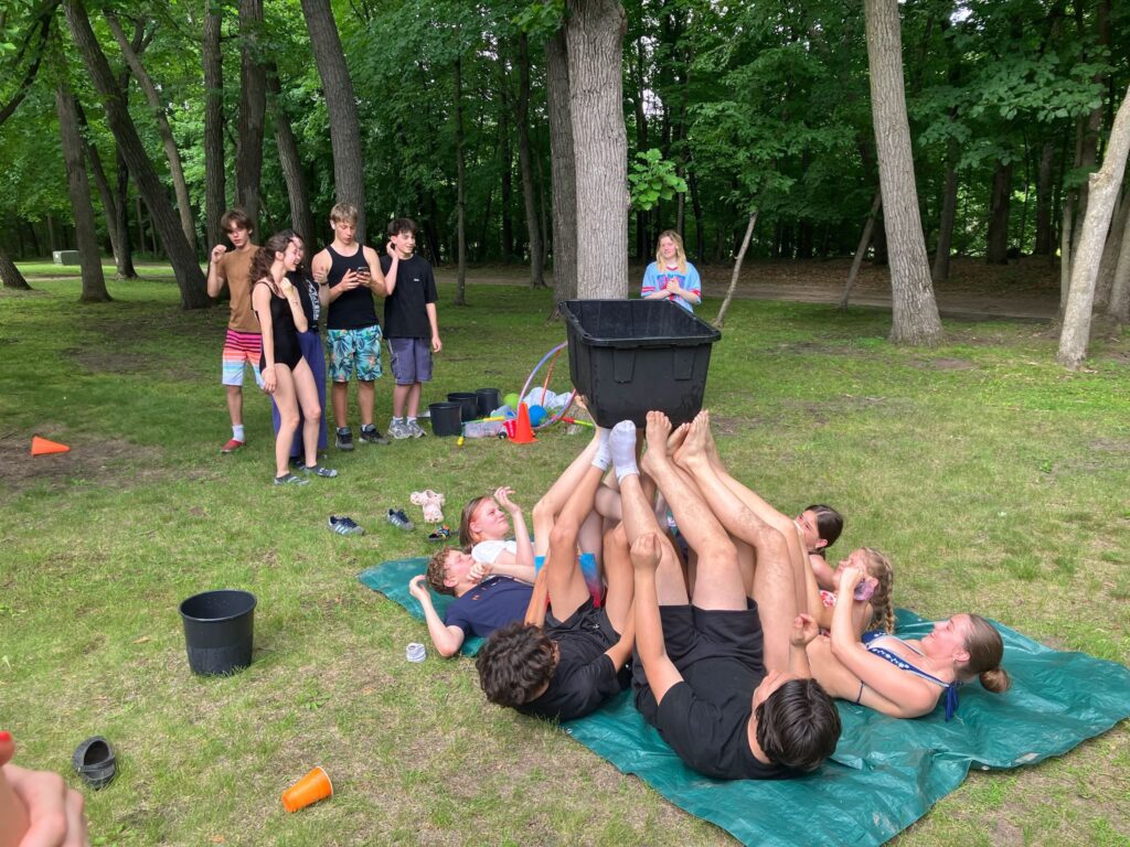 После плавания и волейбола на плаже, они отдохнули от жары и участвовали в водной эстафете. Все промокли! Затем ребята занимались разными лагерными активностями: рыбалка с лодки, стрельба из ружей, и веревочный курс.